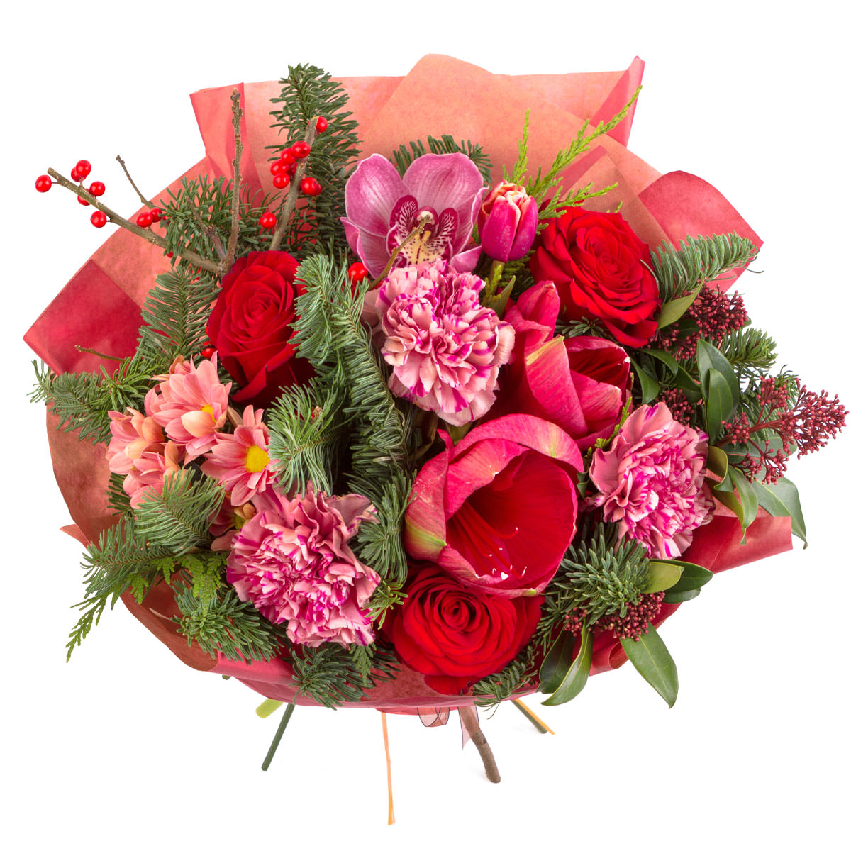 Роза одноголовая красная, амариллис, орхидея розовая, хризантема кустовая розовая, пион, илекс, пихта. Упаковка (лента, пленка, крафт, сетка, пленка матовая)